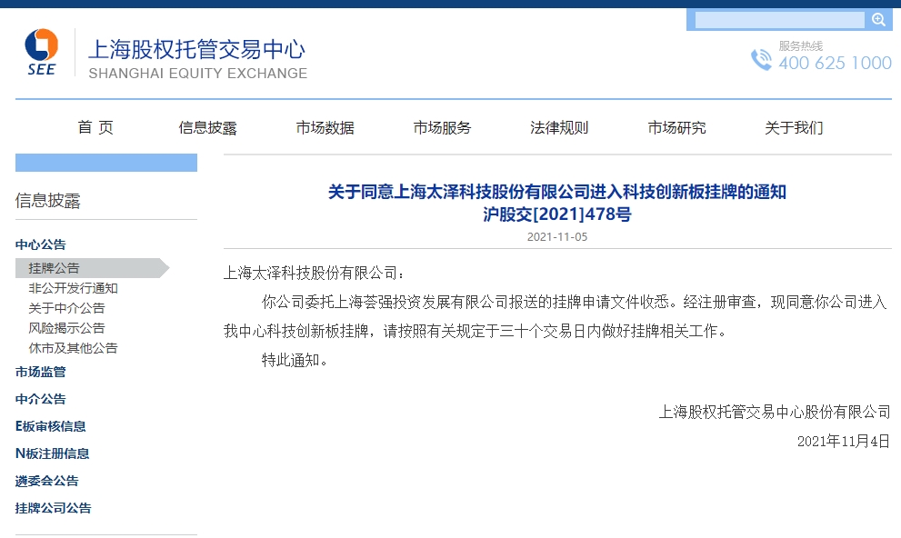 2021年11月4日,我司获批进入上海股权托管交易中心挂牌。