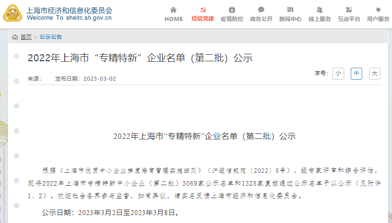 3月2日,上海市经济和信息化委员会公示了2022年上海市“专精特新”企业名单,我司榜上有名,荣获 上海市“专精特新”企业称号 !