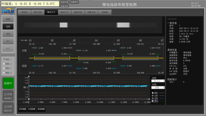 ● 锂电池涂布视觉检测系统是一个检测涂膜、AT9/凹版的横向、纵向以及AB面错位尺寸的系统,并且还可以与纠偏机构结合,实现AB面错位精确控制;可以检出AT9、涂膜表面的漏涂缺陷,目前在某锂电大厂由我们独家提供;2015年底,我们最早开始了此系统的研发和实施,已具备非常丰富的实施经验。