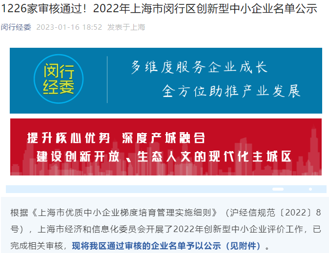 上海市闵行区创新型中小企业公示名单
