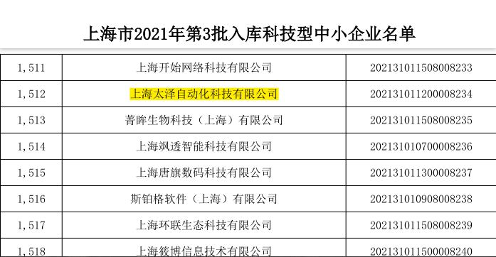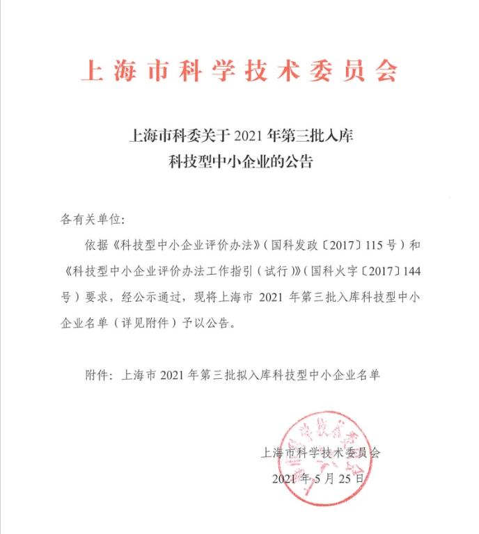2021年5月25日,公司正式入选上海市2021年科技型中小企业名单。